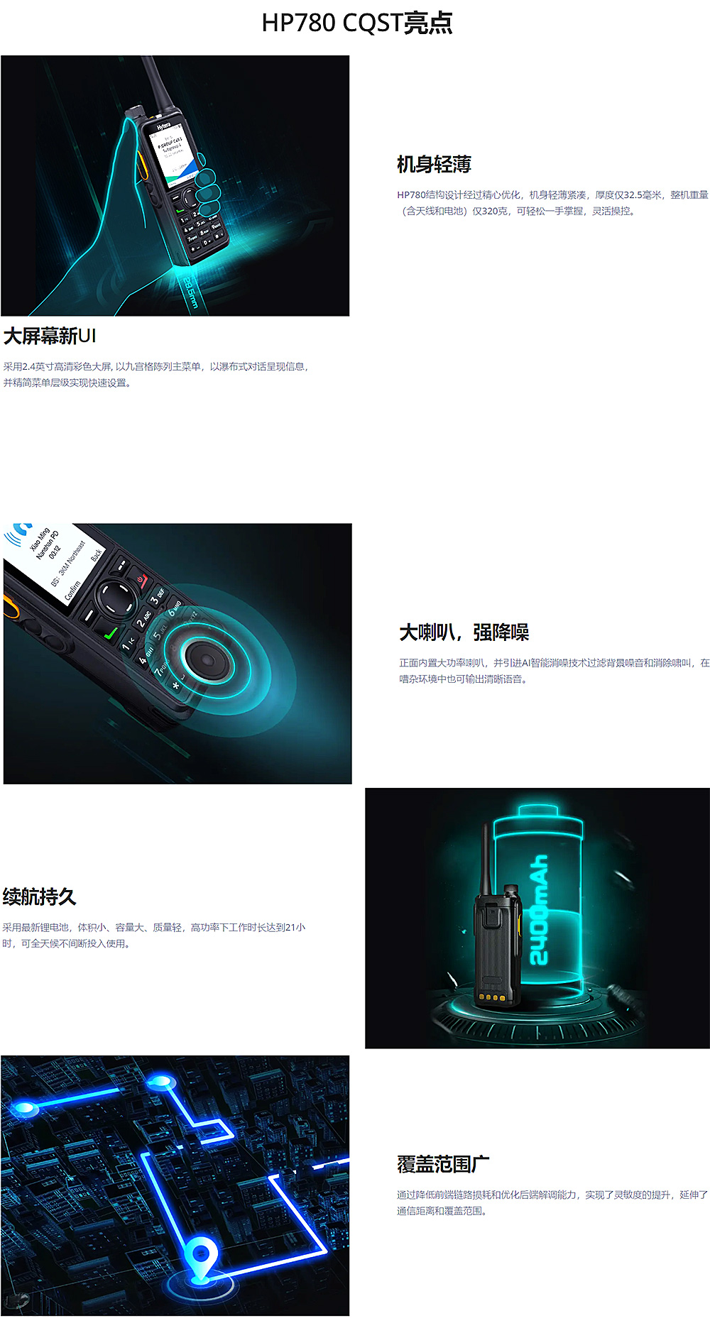HP780从创新出发,在外观和功能上进行突破性的设计开发,支持数字集群(PDT集群)、数字常规(PDT常规及DMR常规)、模拟集群(MPT1327集群)、模拟常规五种工作模式,并以超清音频、超强电池、超快响应、超轻重量和坚固可靠,为行业用户带来更可靠、更高效和更舒适的通信体验。