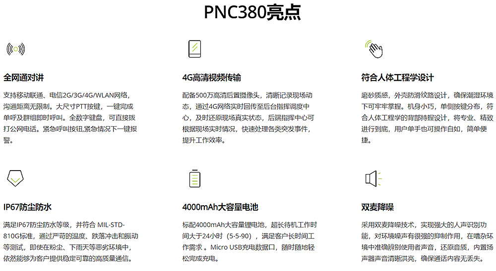 海能达公网对讲机PNC380具有强大的对讲、公网集群调度、精准定位功能,支持2G/3G/4G/WLAN的全网通信,满足广覆盖的通信需求。全数字键盘设计,操作快速便捷,摄像头实时记录现场动态,协作指挥中心人员高效完成指挥调度工作。PNC380公网对讲机适用于城管、机场、铁路、物业管理、物流、大型工业园区等行业。