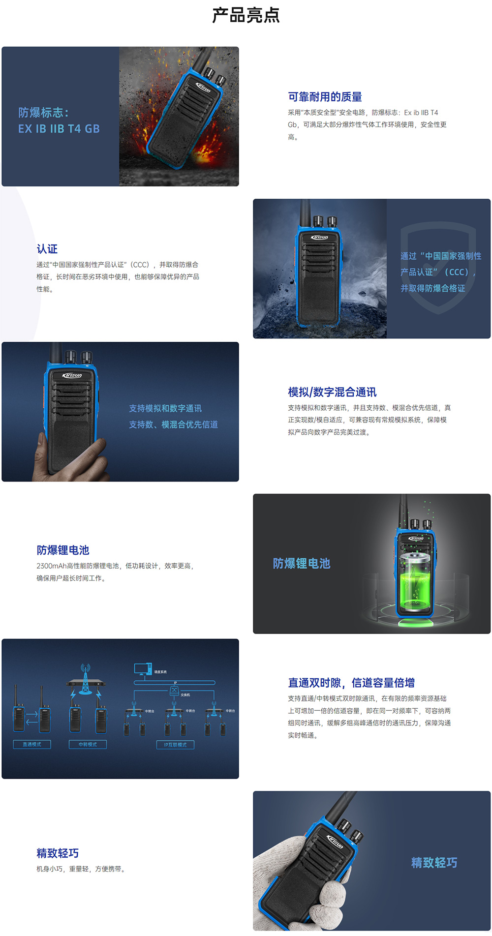 DP515数字防爆对讲机符合GB3836.1-2021和GB3836.4-2021标准,可用于易爆危险区域1区和2区,本产品采用本质安全防爆技术,具有丰富的数字应用功能,出色的语音质量,是危险气体工作环境中最理想的专业通讯对讲设备。